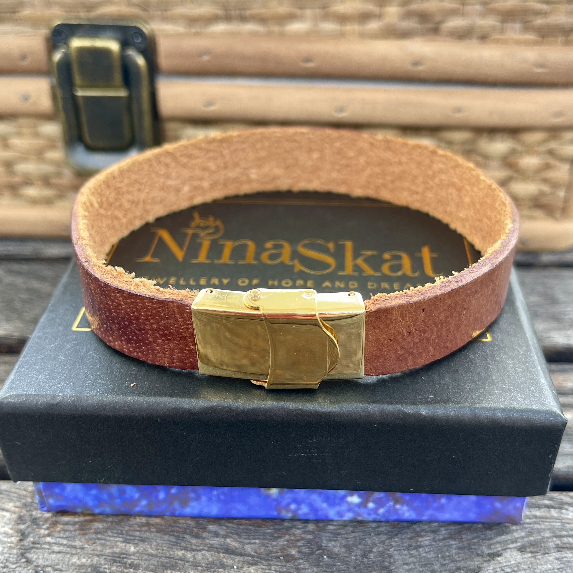 Materiale: Gyldenbrun læder med forgyldt kirurgisk stål.