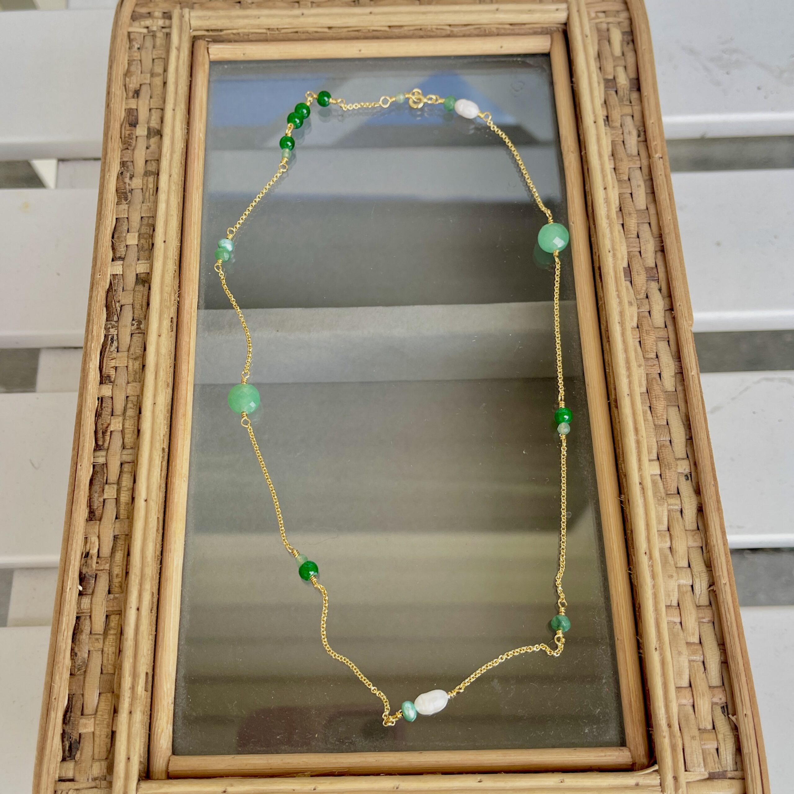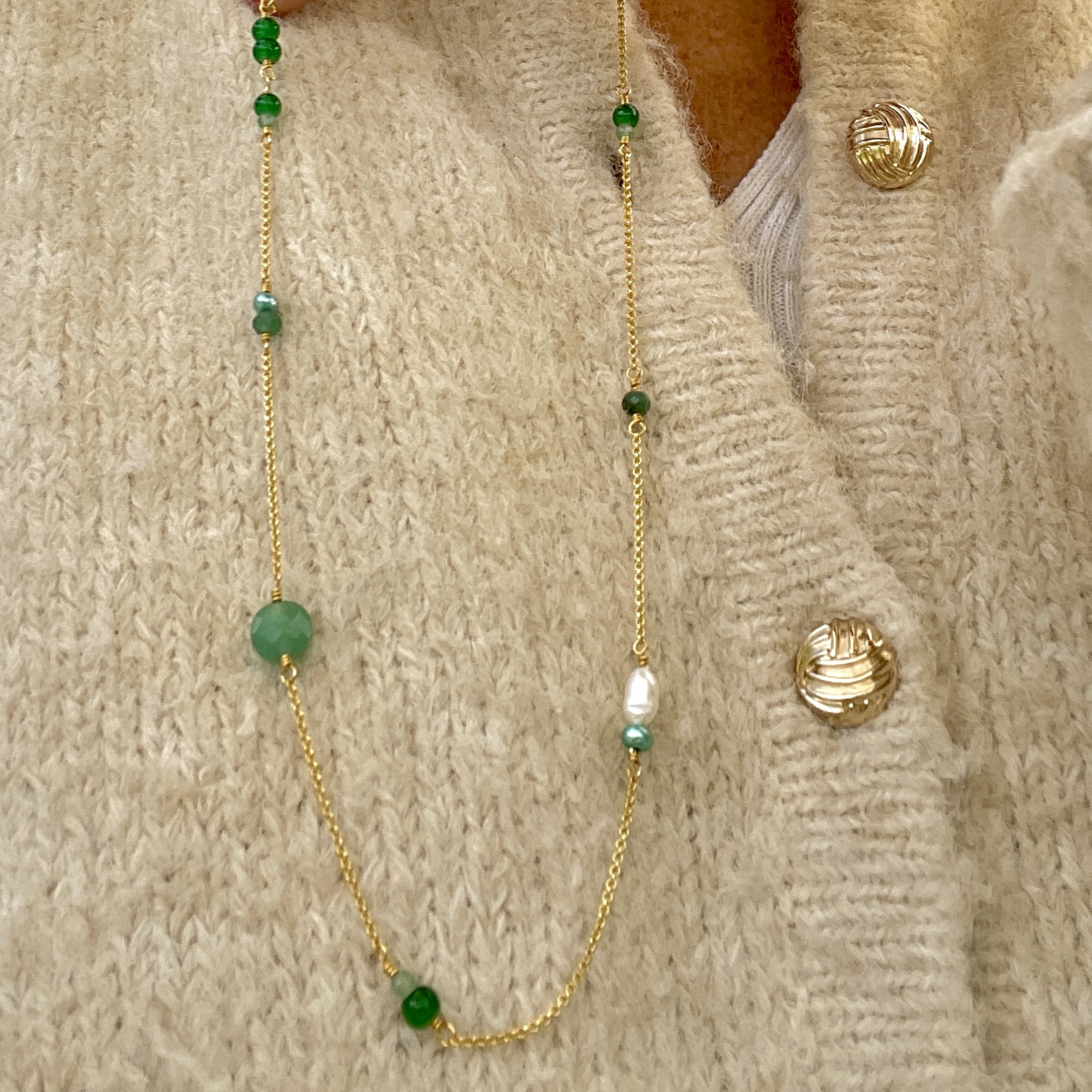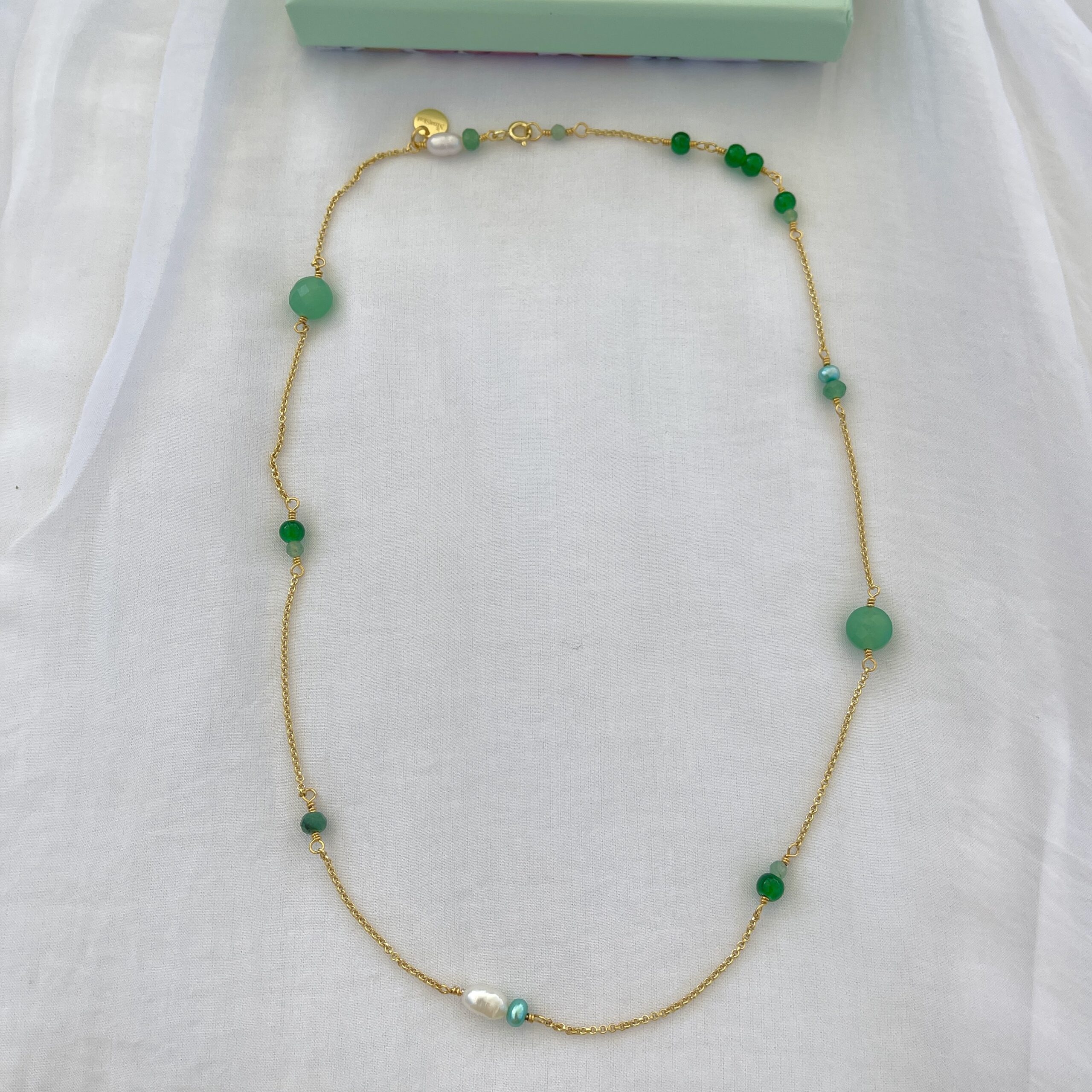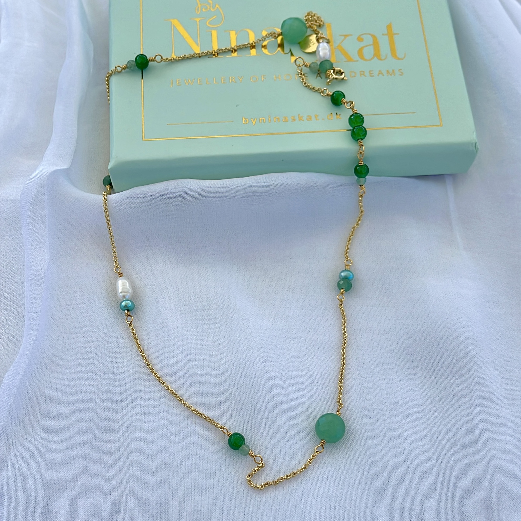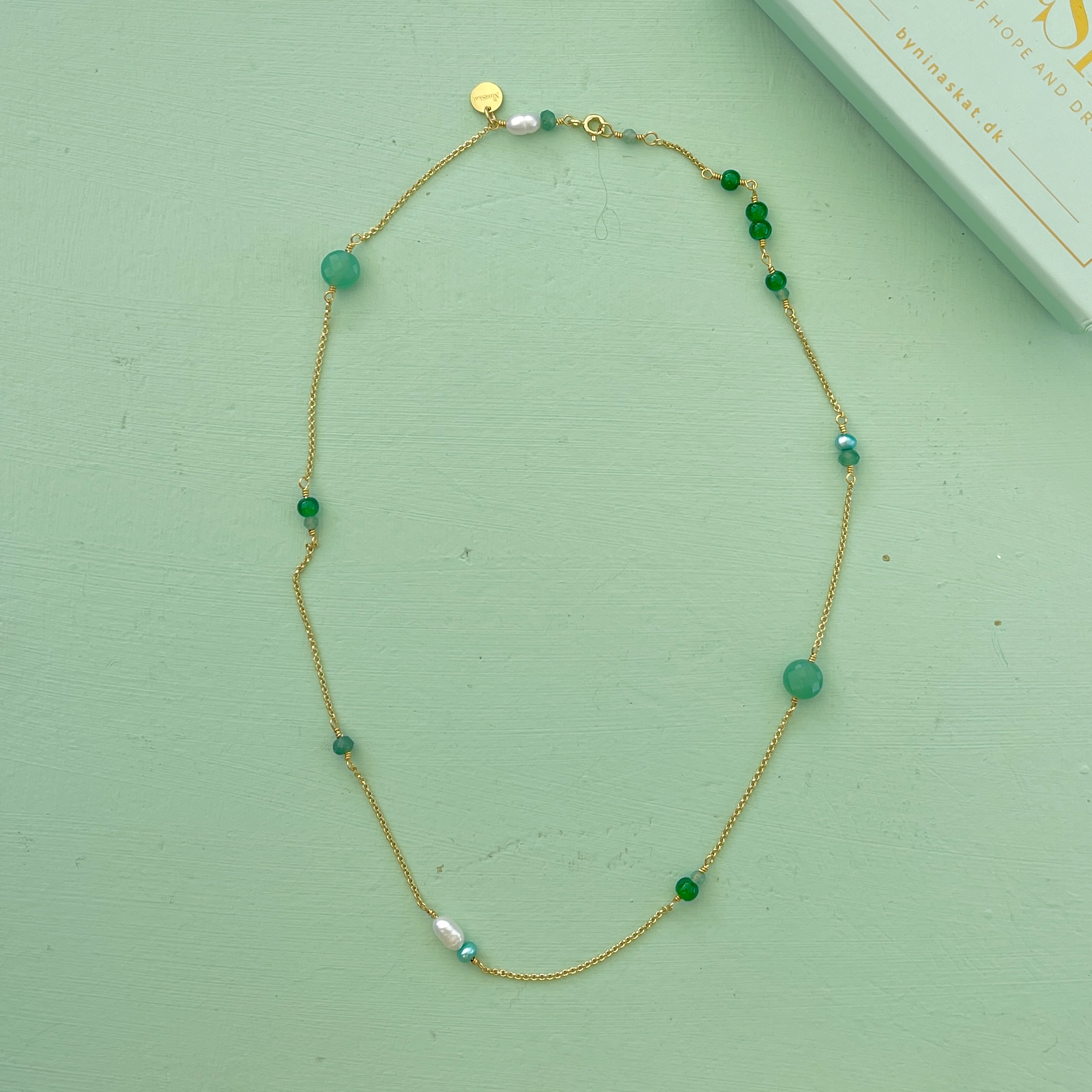 Ankerkæde, jade, aventurin, ferskvandsperle og logomønt ved lukning.
