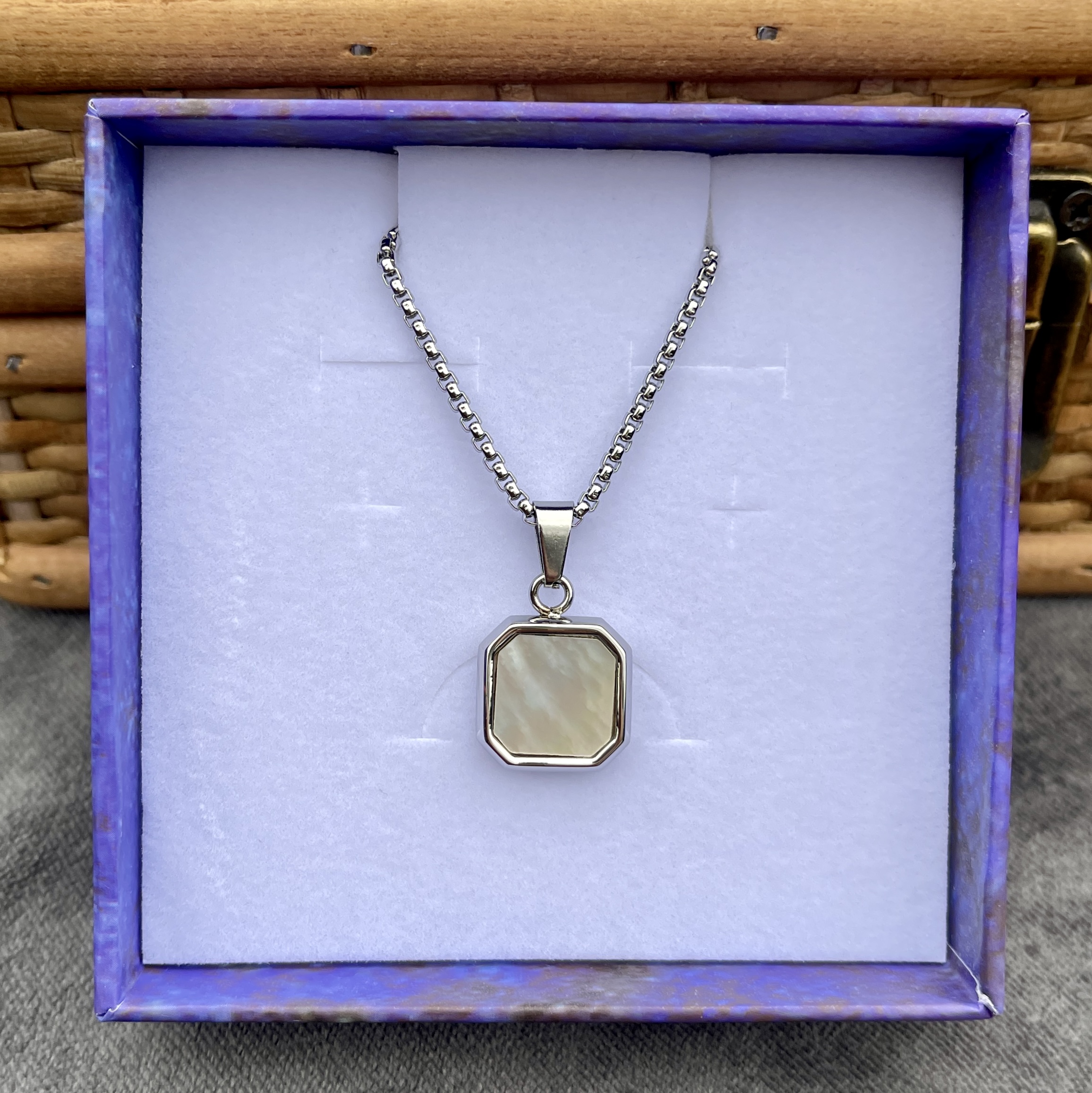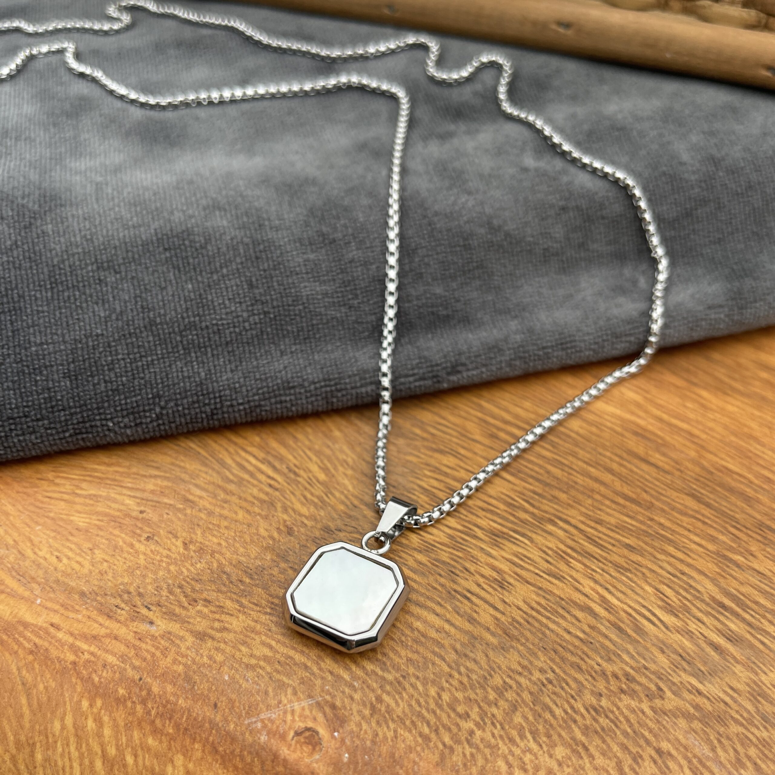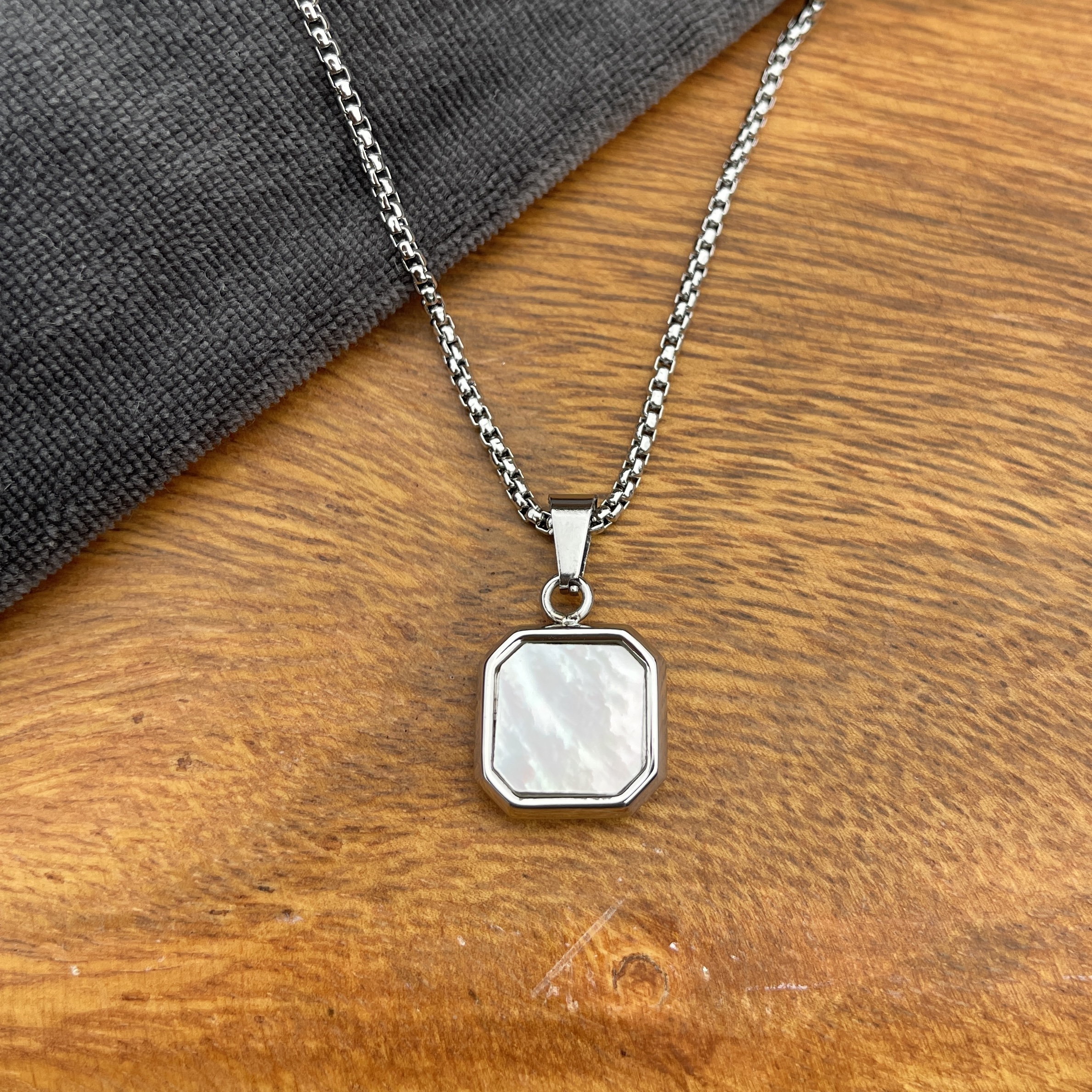 Denne maskuline kæde kombinerer et kraftigt, poleret kædeled med et elegant, ottekantet shell-vedhæng. Det rå, men enkle design giver et moderne og selvsikkert udtryk, perfekt til manden der vil bære et smykke med kant.