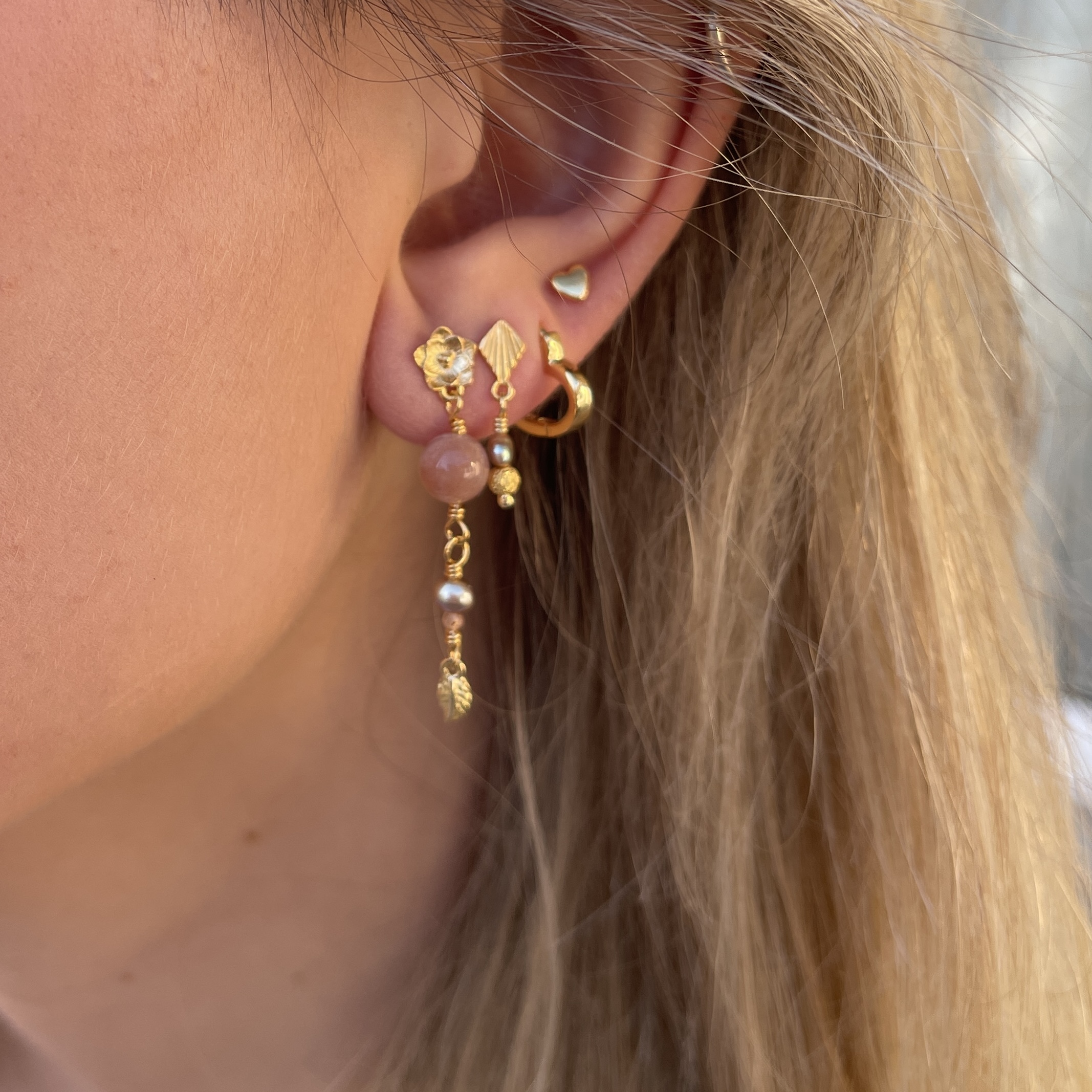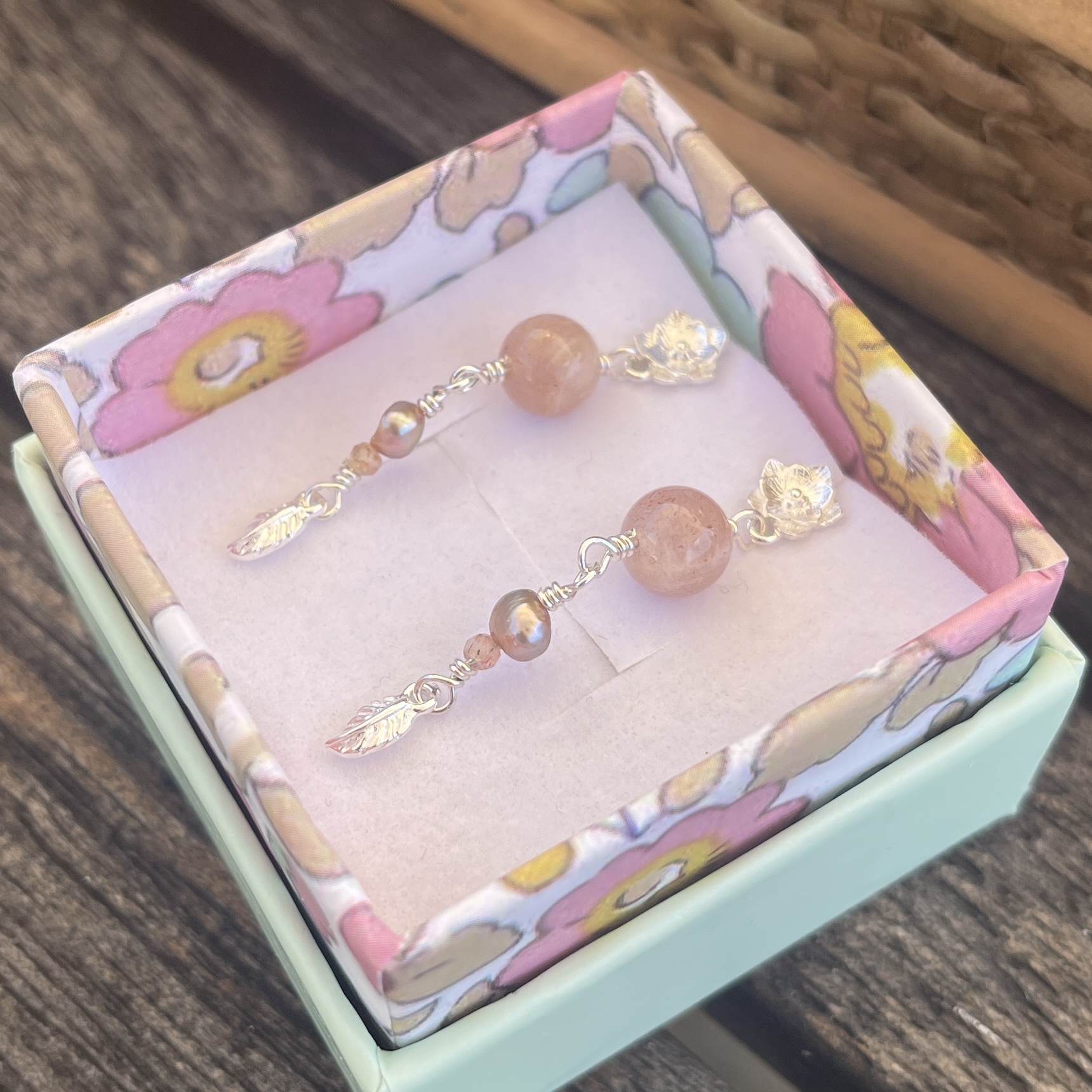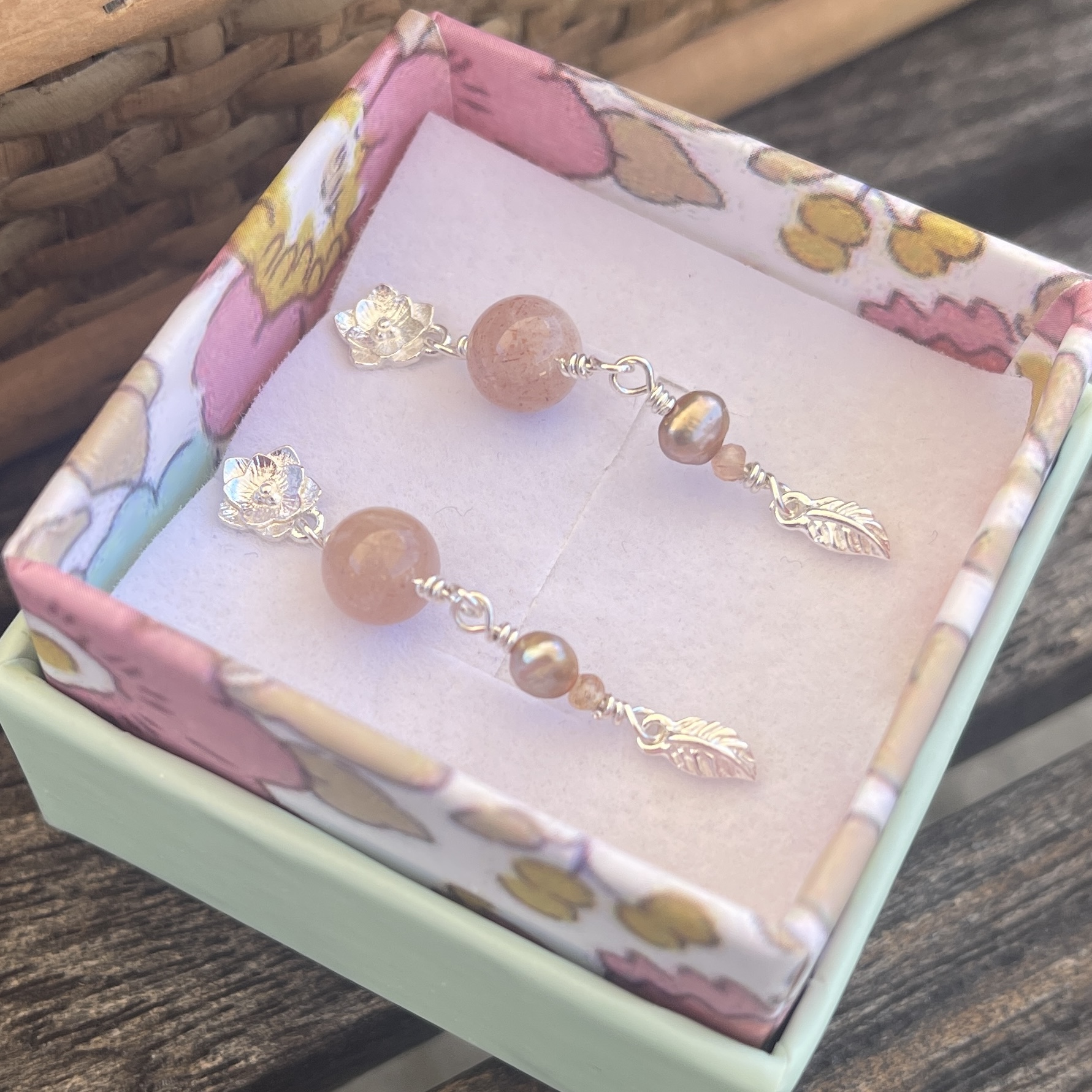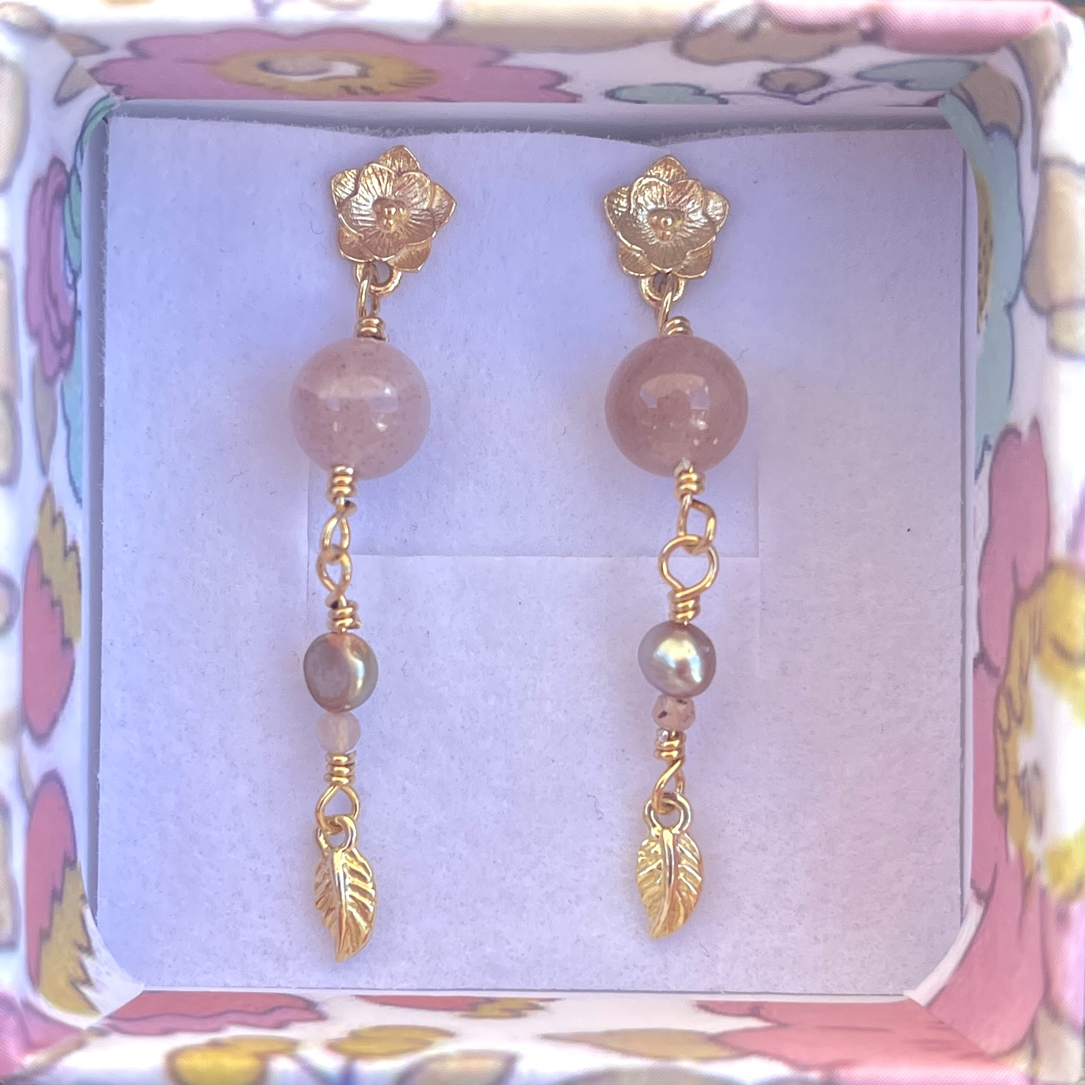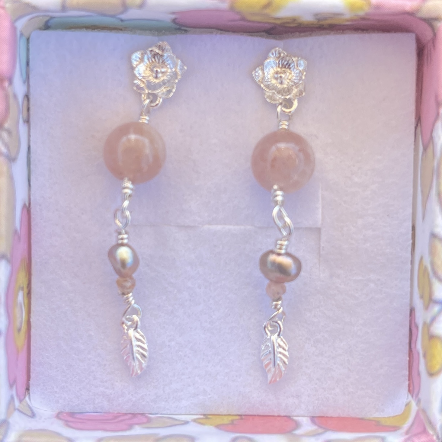 Materiale: Vælg ml. sterlingsølv eller 18 karat guldbelagt sterlingsølv. Ørestikker med blomst, solsten og ferskvandsperle.