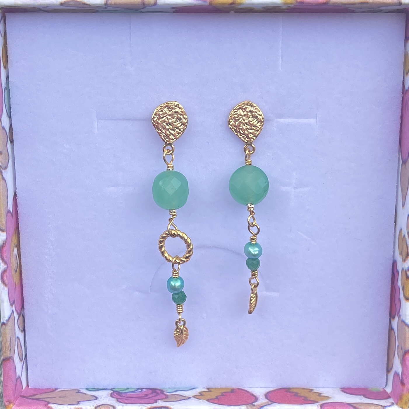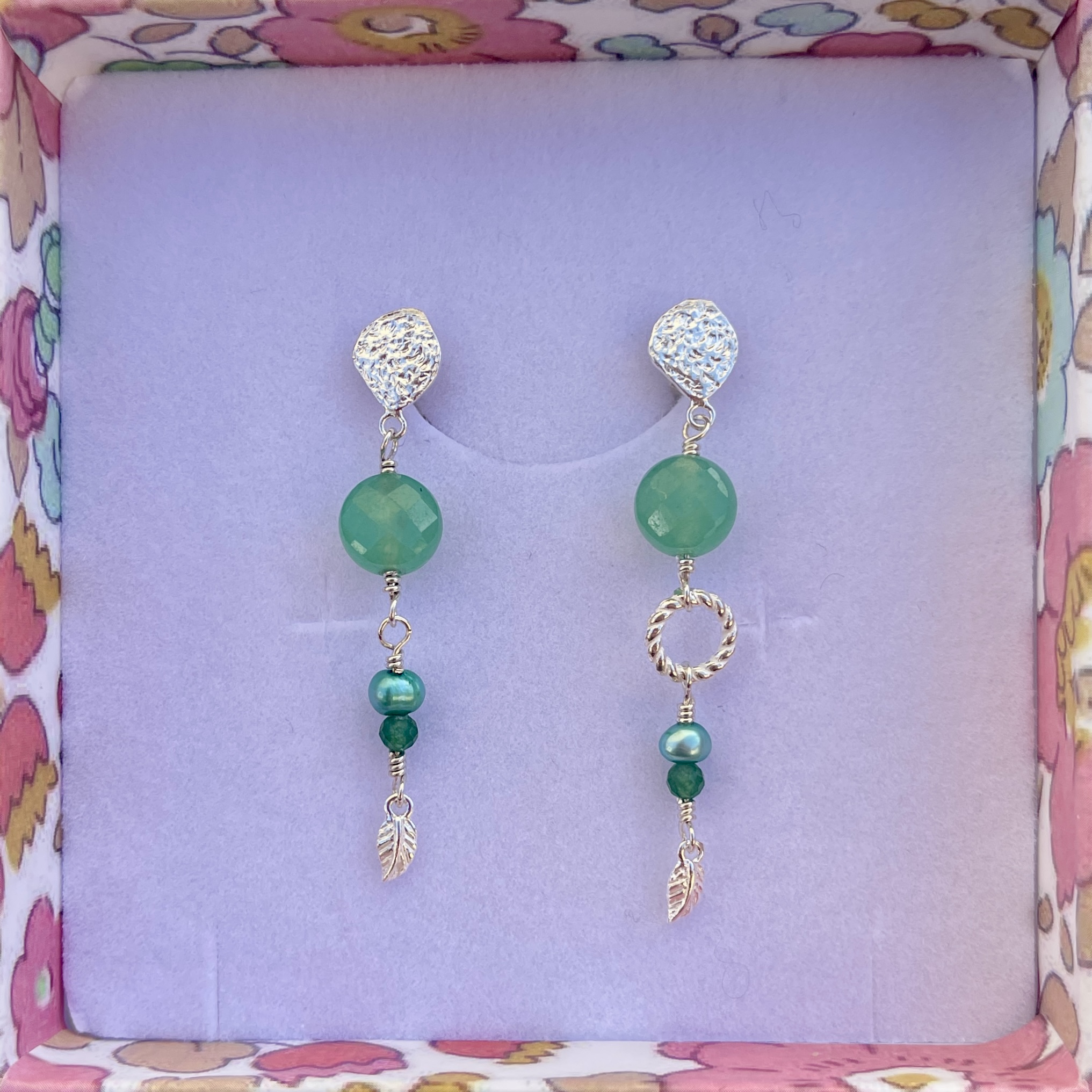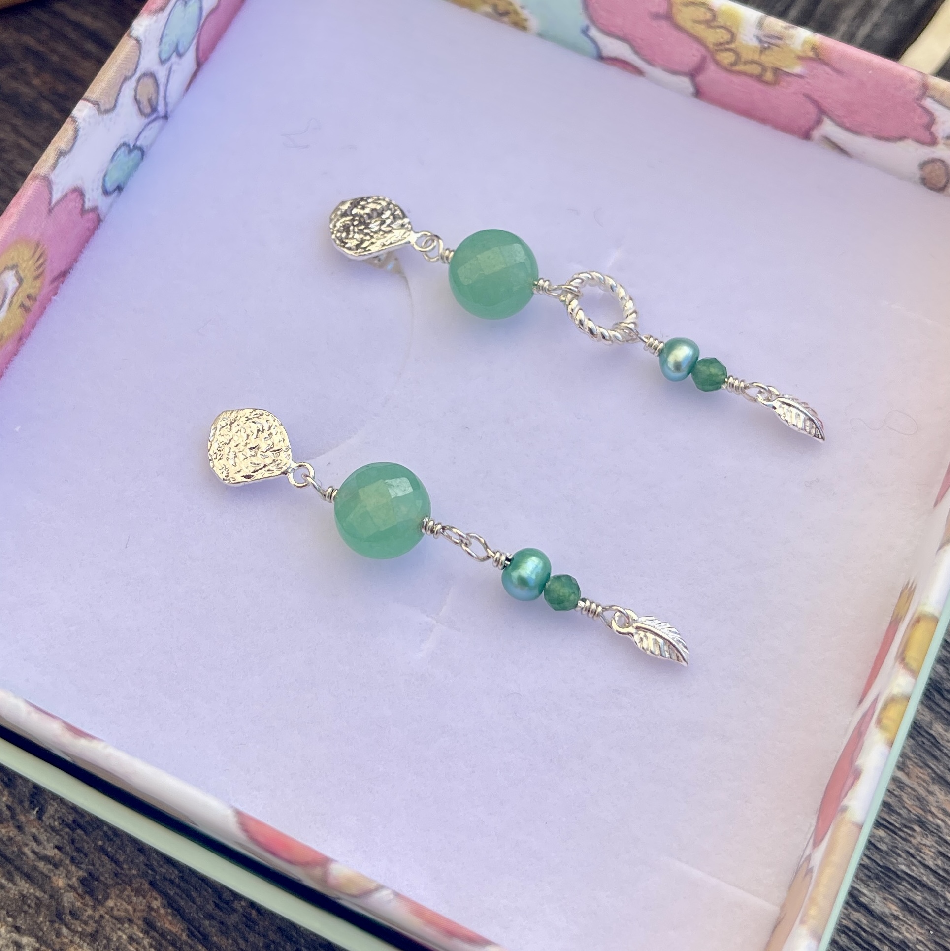 Ørestikker, aventurin, ferskvandsperle og blad.